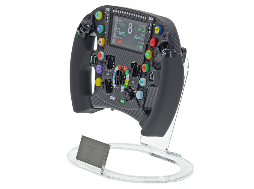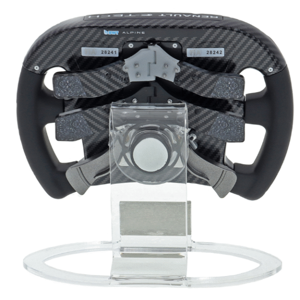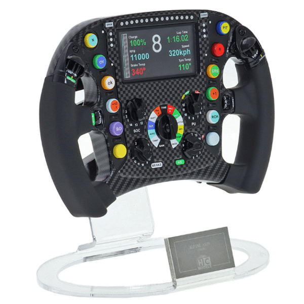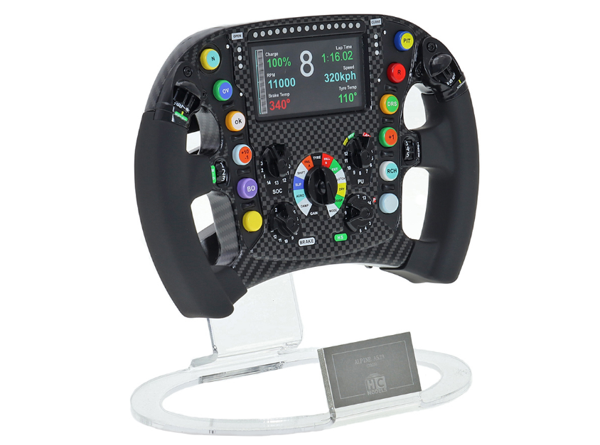 Esta réplica em escala 1:2 captura cada detalhe do volante original, reproduzindo fielmente o design ergonômico, a disposição dos botões e o acabamento sofisticado que fizeram parte da batalha da Alpine contra as principais forças do grid.